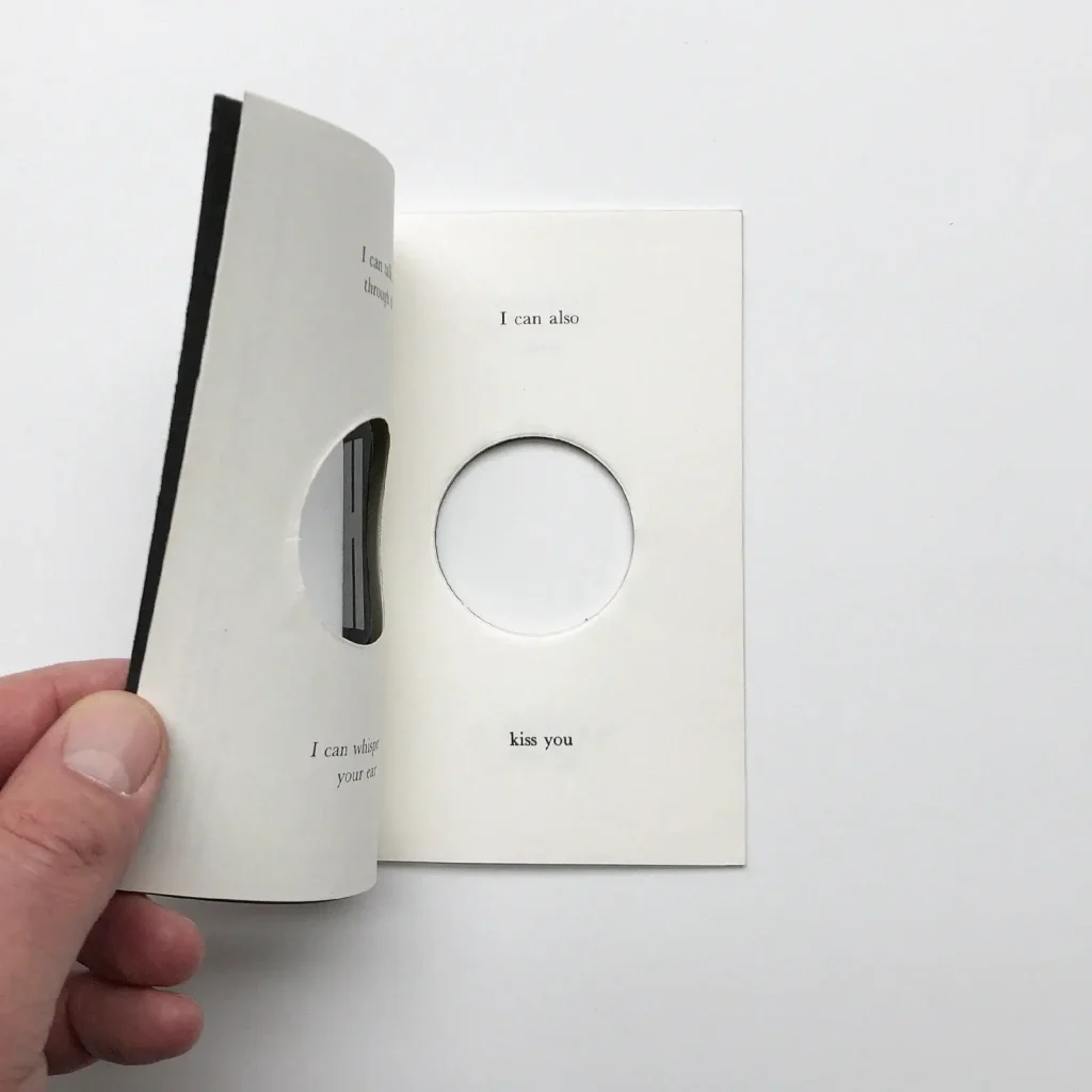 我們不用透過這個洞去觀察周遭、尋找這個洞的使用功能,只需看著每頁的文字以及正中央的洞口,冥思自己的解讀及聯想:「I can talk with you through the book/I can whisper in your ear/I can also kiss you……」。