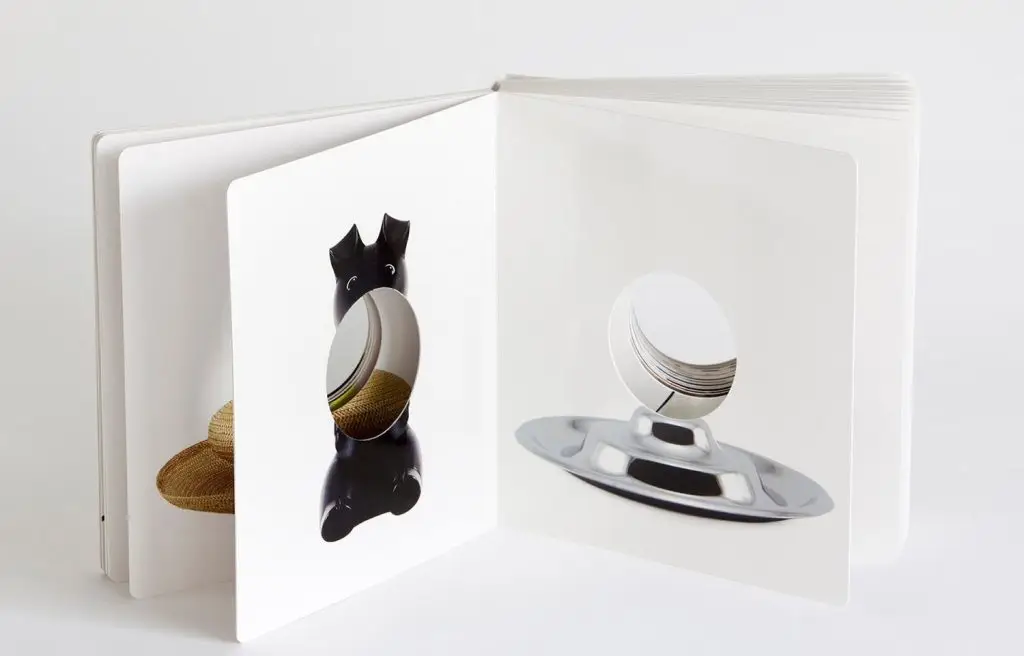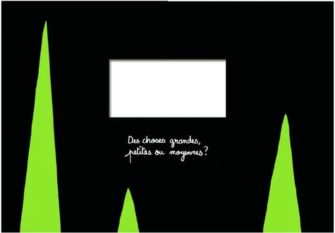 這樣的概念也同樣運用於另一位法國作家 Édouard Manceau 的繪本《Le Petit Curieux》,只是圓形改為橫矩形,內頁的圖像元素也降至極低,每個跨頁幾乎以黑底為主並加上一個問句,引導讀者透過洞口去尋找周圍環境的特定顏色、幾何形狀、距離某物是否近或遠、它是大還是小⋯⋯相較於《洞裡有什麼?》的多元玩法,《Le Petit Curieux》更聚焦體現書籍作為「觀景窗」引導注意力的概念,這也可見於法國版使用鏡面鋁箔紙的封面設計,不管拿到哪都能倒映出周遭景象,如同隨時隨地都能被激起的好奇心(正如法文書名之意)。
