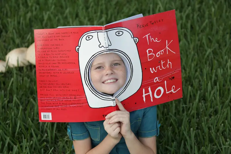 首先是在台灣親子界頗著名的《洞裡有什麼?》(The Book with a Hole),由泰德現代藝術館邀請法國作家 Hervé Tullet 製作的繪本。鮮紅的封面上有半張臉,大大張著嘴,當把半圓形的嘴巴拆掉後再翻開書——每個跨頁的正中央都出現了一個大洞!