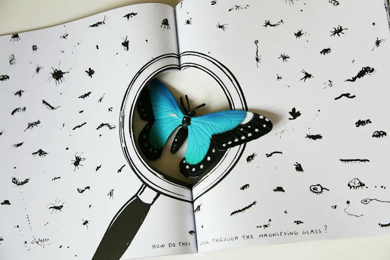 搭配頁面上的黑白圖像,這本書有時成了面具、有時成了場所,甚至是可以投球的籃框,又或是一個引領你向周圍探索的窗口。