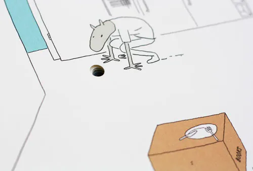 第二本被完全貫穿的繪本是挪威作家 Øyvind Torseter 的《The Hole》,他曾於訪談表示,「我想製作一本非常實體(physical)的書。所以在很多素描本上鑽了洞,並以這些洞為起點開始進行繪畫⋯⋯這本書在電腦螢幕上看毫無意義,因為它是一個只能以實體書來敘述的故事。」1