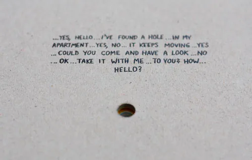 相較於《The Hole Book》,Øyvind 更進一步將洞口轉化成「物質性」的,可以放進口袋及紙箱裡、用手抓住,甚至在儀器裡電擊;搭配畫面設計,這些洞「既是靜態的又是移動的:相對於書籍框架是固定的,相對於插圖卻是移動的;也產生一種相對運動:可以同時存在於兩個不同的空間中。」2